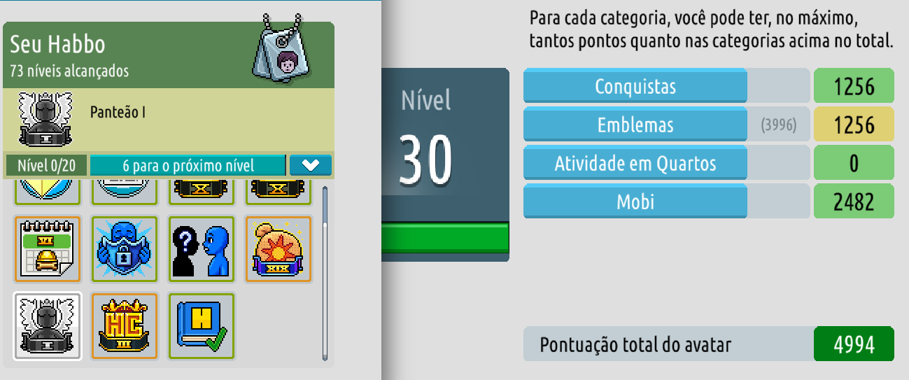 Assim que você chega no nível 30 no Habbo você começa a upar ele com seus xps (pontuação total do avatar que pode ser visualizado no cliente Moderno). Nesse caso você vai precisar de 5000 pontos de experiência para desbloquear o nível 1: