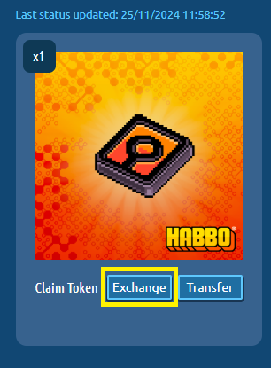 Depois de comprar o selo pela TokenTrove, você deve converter o Token na página de Colecionáveis do Habbo (collectibles.habbo.com), na aba de Tokens: